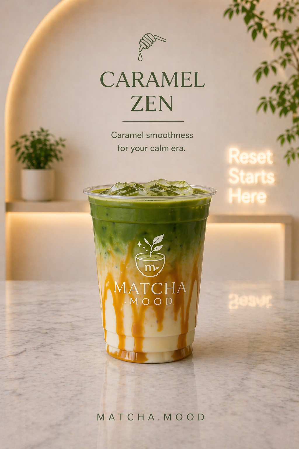 Caramel lembut dipadu dengan matcha yang earthy buat menenangkan